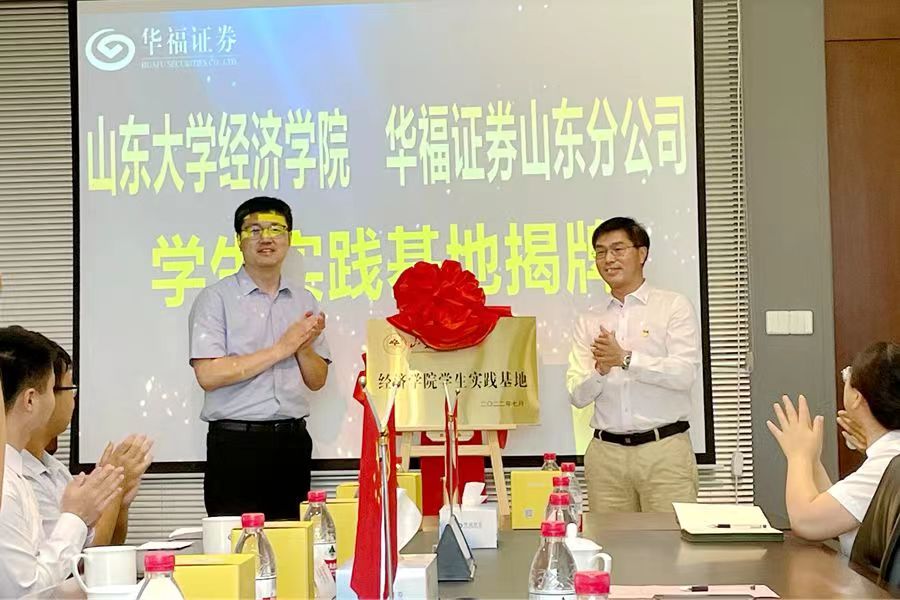 张志勇和李良杰代表双方为学生实践基地揭牌。华福证券山东分公司综合部总经理刘超汇报了实习生培养工作。实习学生代表李金泰、冯新羽、季婕、柳树、刘晋、李嘉浩等依次发言,分享了实习收获感受,表达了对企业和学校的感恩感谢。根据双方协定,21名经济学院学生在华福证券山东分公司开展了为期1个月的专业实习,公司为实习学生提供实习岗位,并配备导师进行专业指导。